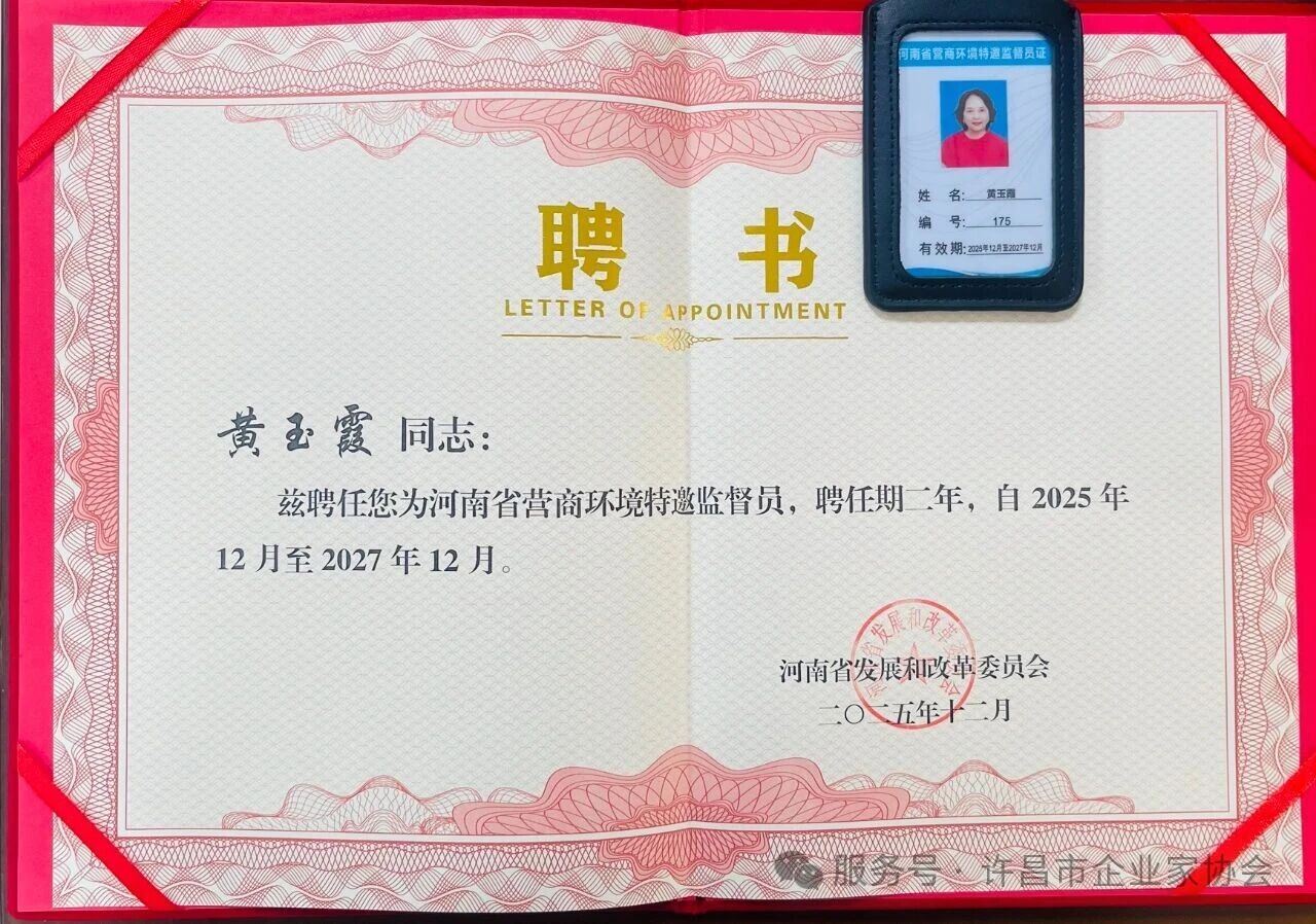 近日,河南省發(fā)展和改革委員會(huì)正式公布2025-2027年河南省營(yíng)商環(huán)境特邀監(jiān)督員聘任名單,許昌市企業(yè)家協(xié)會(huì)秘書長(zhǎng)黃玉霞成功入選,擔(dān)任新一屆特邀監(jiān)督員。